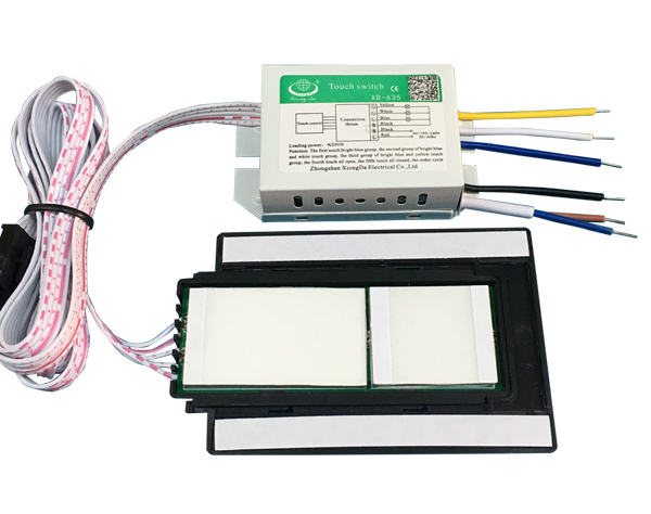 接线方式:2P护套线接AC:220V输入,黑线和蓝线为第一组输出接灯具,黑线再与白线为第二组输出接灯具,黑线再与黄线为第三组输出接灯具,白色的触摸头安装在镜子的背面。 |